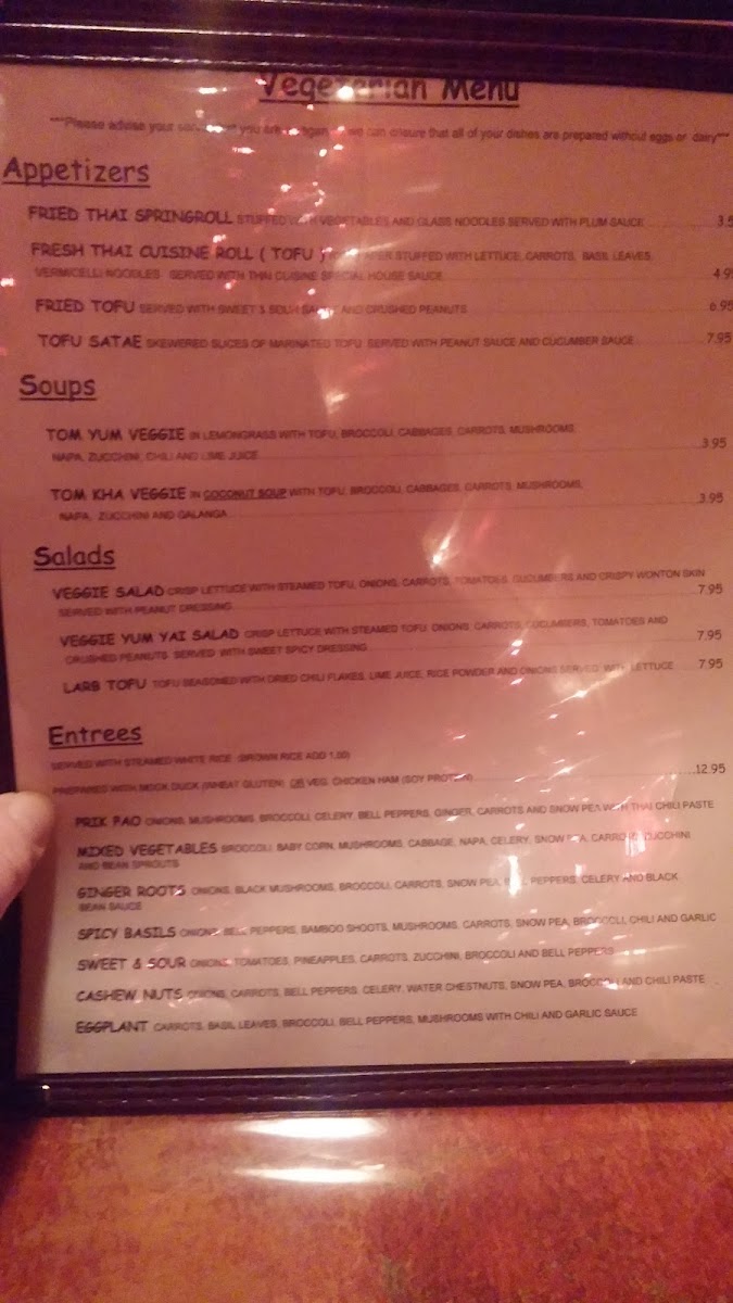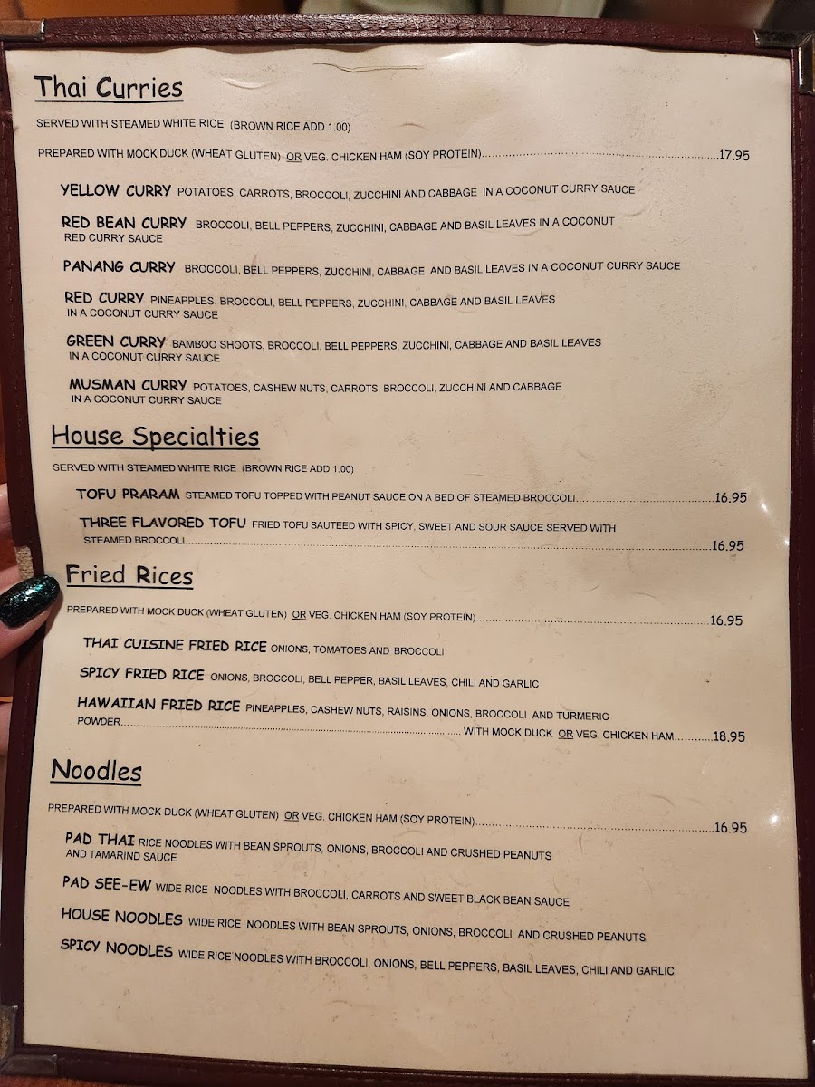 “ This was my first time at Thai Cuisine. This is a solid restaurant with great personality and amazing curry. I ordered the duck curry and the fried Thai rice with chicken. I also ordered the spring rolls. Everything was delicious and with the heat level that I requested. I strongly recommend this restaurant. ”